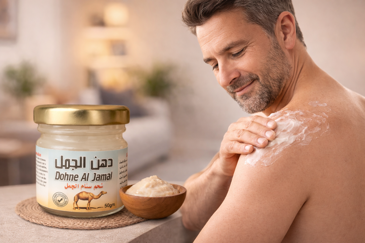 Notre Baume à la graisse de chameau est un soin traditionnel marocain formulé à partir de graisse de bosse de chameau (daroua), utilisée depuis des générations pour ses vertus apaisantes et nourrissantes.